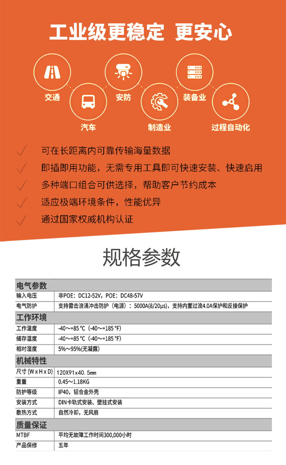 工業級(NT品牌)非網管1千光1千電,SFP接口,導軌式-DC12~52V供電-寬溫(-40℃-85℃)。默認不含AC電源適配器。 |