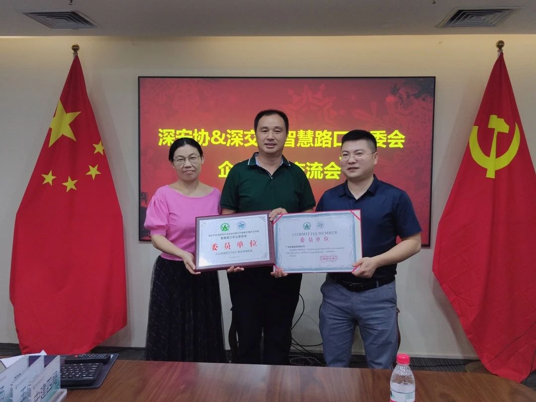 圖為深安協(xié)&深交協(xié)-智慧路口專委會主任、宇航工業(yè)交換機劉偉成和秘書長王小華為豐上光電科技有限公司總經(jīng)理劉洋頒發(fā)智慧路口專委會委員單位牌匾。