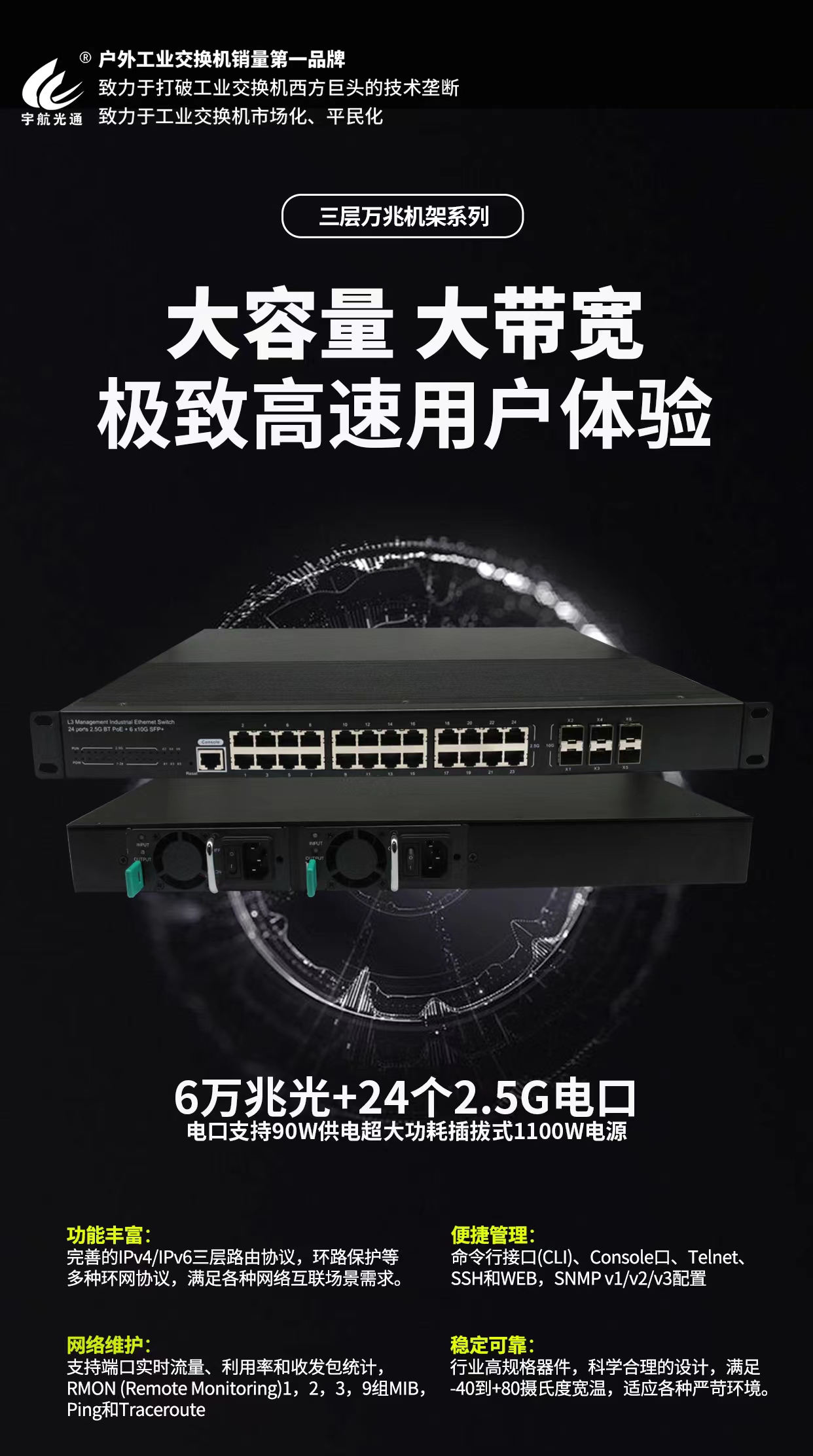宇航6萬兆+24個(gè)2.5G電口工業(yè)交換機(jī)單個(gè)端口BT-90W-POE供電,雙電源1100W超大功率,高帶寬、穩(wěn)定可靠、功能豐富、電源冗余、網(wǎng)絡(luò)維護(hù)以及便捷管理等特點(diǎn),為用戶提供了極致的高速體驗(yàn)和可靠的網(wǎng)絡(luò)連接。它具有6個(gè)10G上行主干光口和24個(gè)2.5G電口,可以滿足大規(guī)模數(shù)據(jù)傳輸?shù)男枨?。行業(yè)高規(guī)格器件和科學(xué)合理的設(shè)計(jì),使其能夠適應(yīng)各種嚴(yán)苛的環(huán)境,確保設(shè)備在各種條件下都能穩(wěn)定運(yùn)行。雙電源模塊,支持AC/DC多種供電方式。支持端口實(shí)時(shí)流量、利用率和收發(fā)包統(tǒng)計(jì)等網(wǎng)絡(luò)維護(hù)功能,更好地監(jiān)控和管理網(wǎng)絡(luò)。