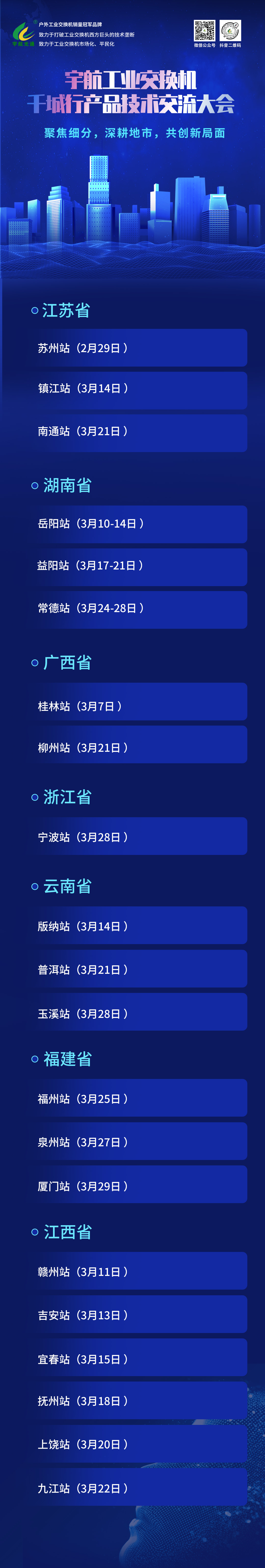 三月,宇航將攜手眾多合作伙伴和宇航全國產(chǎn)工業(yè)交換機,在濟(jì)南、西安、鄭州、合肥、武漢等地參展,與各界朋友共襄盛舉。同時,宇航還將深入江蘇、湖南、廣西、浙江、云南、福建、江西等地,舉行宇航工業(yè)交換機千城行產(chǎn)品技術(shù)交流大會,助力各行各業(yè)的數(shù)字化轉(zhuǎn)型,讓數(shù)字化轉(zhuǎn)型的春風(fēng),吹滿神州大地!