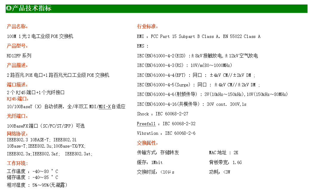 2路百兆POE電口+1路百兆SFP光口工業級以太網POE交換機,支持2個10/100Base-TX電口和1個100Base-X光口。產品符合FCC、CE、ROHS標準。RD12FP系列交換機具有-40℃~80℃的工作溫度,具有超強的堅固度能適應各種嚴苛環境,也可以非常方便的安置在空間緊湊的控制箱中。導軌的安裝特性、寬溫操作及擁有IP40防護等級的外殼及LED指示燈,使RD12FP成為一個即插即用的工業級設備,為用戶的以太網設備聯網提供可靠、便捷的解決方案。
