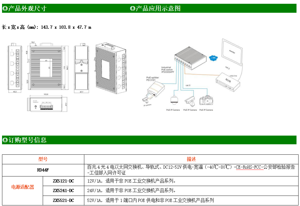 4路百兆電口+4路百兆光口工業級以太網交換機,支持4個10Base-T/100Base-TX電口和4個100Base-FX(SC/FC/ST可選)光口。產品符合FCC、CE、ROHS標準。RD44F交換機具有-40℃~80℃的工作溫度,具有超強的堅固度能適應各種嚴苛環境,也可以非常方便的安置在空間緊湊的控制箱中。導軌的安裝特性、寬溫操作及擁有IP40防護等級的外殼及LED指示燈,使RD44F成為一個即插即用的工業級設備,為用戶的以太網設備聯網提供可靠、便捷的解決方案。