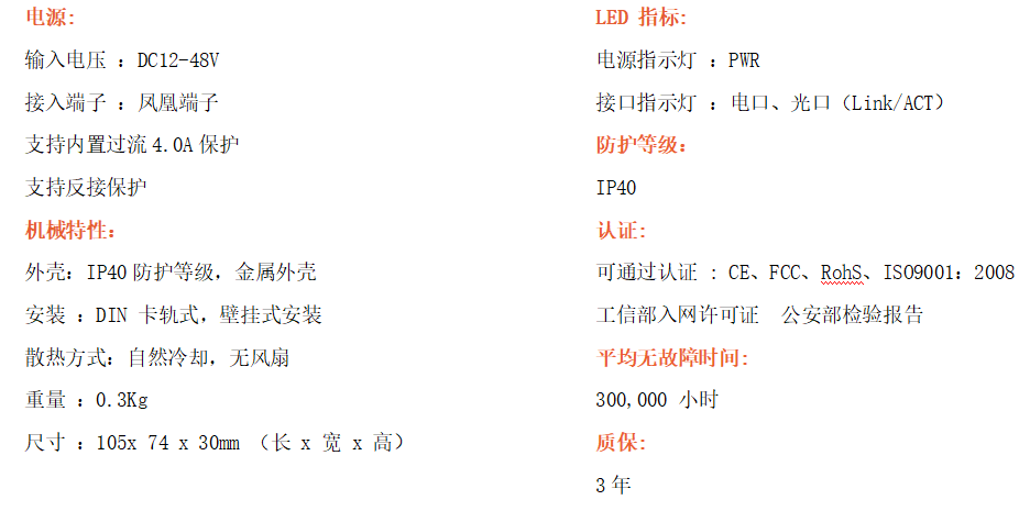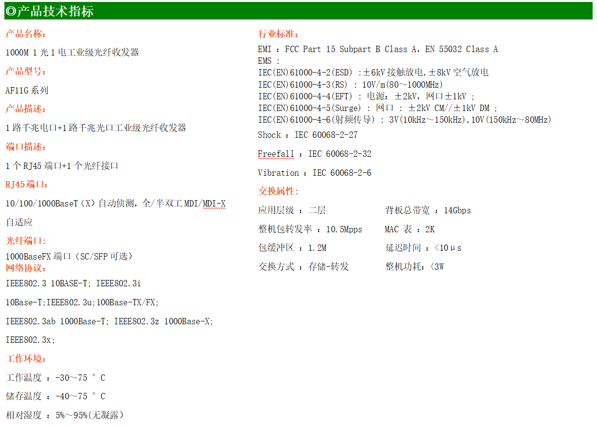 1路千兆電口+1路千兆FX光口工業級以太網交換機,支持1個10Base-T/100Base-T/1000Base-TX電口和1個1000Base-X光口。產品符合FCC、CE、ROHS標準。AF11G系列交換機具有-30℃~75℃的工作溫度,具有超強的堅固度能適應各種嚴苛環境,也可以非常方便的安置在空間緊湊的控制箱中。導軌的安裝特性、寬溫操作及擁有IP40防護等級的外殼及LED指示燈,使AF11G成為一個即插即用的工業級設備,為用戶的以太網設備聯網提供可靠、便捷的解決方案。