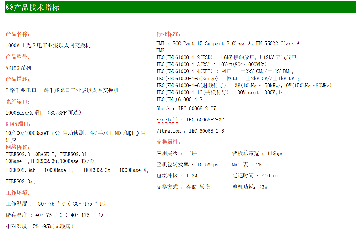 2路千兆電口+1路千兆FX光口工業(yè)級以太網(wǎng)交換機,支持2個100Base-T/1000Base-TX電口和1個1000Base-X光口。產(chǎn)品符合FCC、CE、ROHS標(biāo)準(zhǔn)。AF12G系列交換機具有-30℃~75℃的工作溫度,具有超強的堅固度能適應(yīng)各種嚴(yán)苛環(huán)境,也可以非常方便的安置在空間緊湊的控制箱中。導(dǎo)軌的安裝特性、寬溫操作及擁有IP40防護等級的外殼及LED指示燈,使AF12G成為一個即插即用的工業(yè)級設(shè)備,為用戶的以太網(wǎng)設(shè)備聯(lián)網(wǎng)提供可靠、便捷的解決方案。