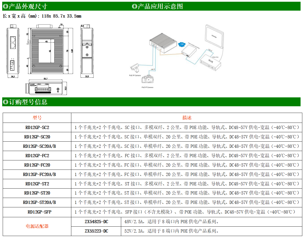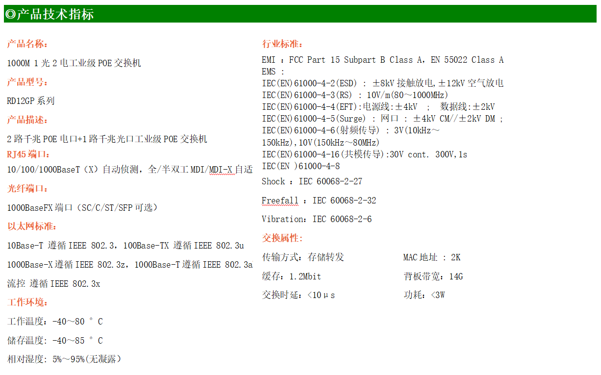 2路千兆POE電口+1路千兆FX光口工業(yè)級(jí)以太網(wǎng)POE交換機(jī),支持2個(gè)10/100/1000Base-TX電口和1個(gè)1000Base-X光口。產(chǎn)品符合FCC、CE、ROHS標(biāo)準(zhǔn)。RD12GP系列交換機(jī)具有-40℃~80℃的工作溫度,具有超強(qiáng)的堅(jiān)固度能適應(yīng)各種嚴(yán)苛環(huán)境,也可以非常方便的安置在空間緊湊的控制箱中。導(dǎo)軌的安裝特性、寬溫操作及擁有IP40防護(hù)等級(jí)的外殼及LED指示燈,使RD12GP成為一個(gè)即插即用的工業(yè)級(jí)設(shè)備,為用戶的以太網(wǎng)設(shè)備聯(lián)網(wǎng)提供可靠、便捷的解決方案。