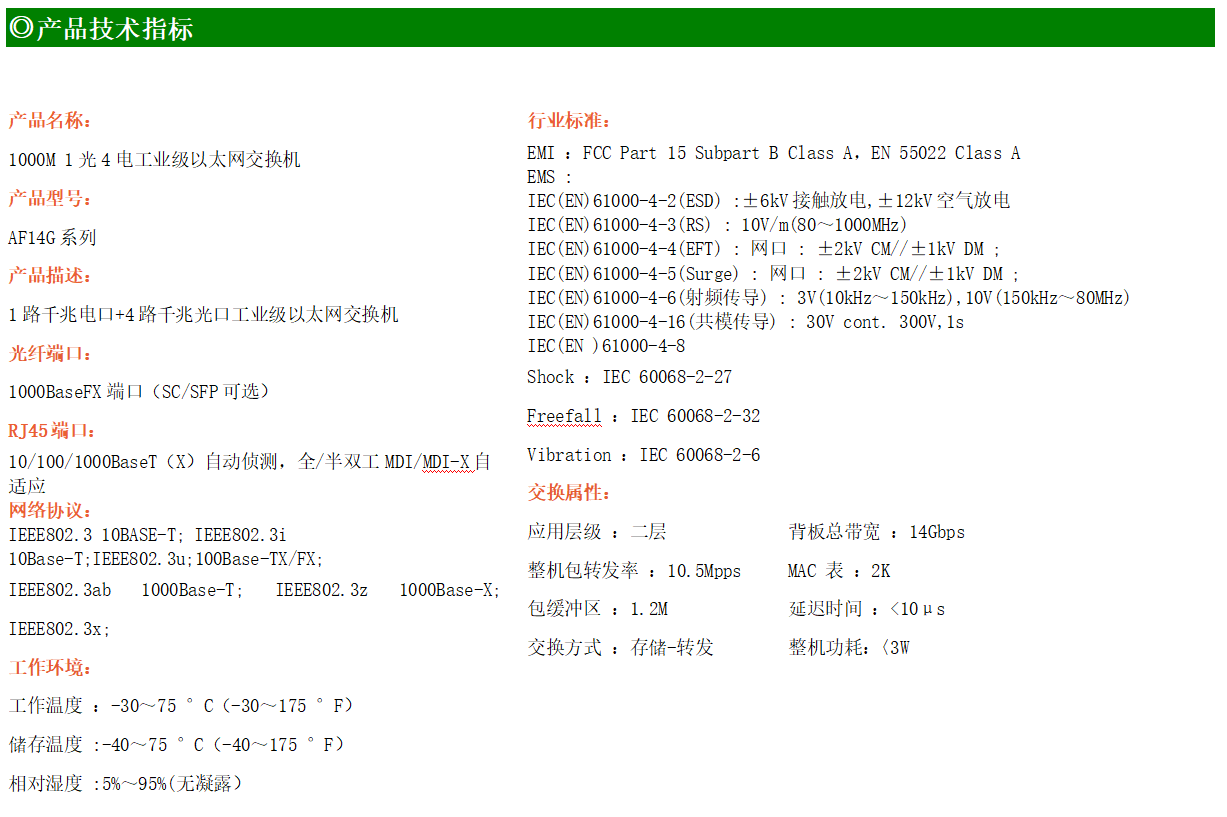 4路千兆電口+1路千兆FX光口工業(yè)級(jí)以太網(wǎng)交換機(jī),支持4個(gè)100Base-T/1000Base-TX電口和1個(gè)1000Base-X光口。產(chǎn)品符合FCC、CE、ROHS標(biāo)準(zhǔn)。AF14G系列交換機(jī)具有-30℃~75℃的工作溫度,具有超強(qiáng)的堅(jiān)固度能適應(yīng)各種嚴(yán)苛環(huán)境,也可以非常方便的安置在空間緊湊的控制箱中。導(dǎo)軌的安裝特性、寬溫操作及擁有IP40防護(hù)等級(jí)的外殼及LED指示燈,使AF14G成為一個(gè)即插即用的工業(yè)級(jí)設(shè)備,為用戶的以太網(wǎng)設(shè)備聯(lián)網(wǎng)提供可靠、便捷的解決方案。