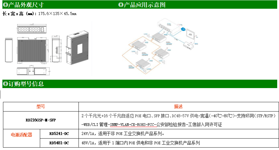 RD216GSP-M是網管型工業以太網POE交換機,產品符合FCC、CE、RoHS標準。支持2個千兆光口和16個千兆POE電口;支持工業現場所需的以太網二層協議,保證通信網絡的穩定性;該系列交換機采用低功耗、無風扇設計,確保無噪聲干擾,同時支持-40~80℃工作溫度和良好的EMC電磁兼容性能,保證在惡劣的工業環境中保持穩定的工作,為工廠自動化,智能交通,視頻監控等工業應用領域組建快速穩定的網絡終端接入網絡提供安全可靠的解決方案。