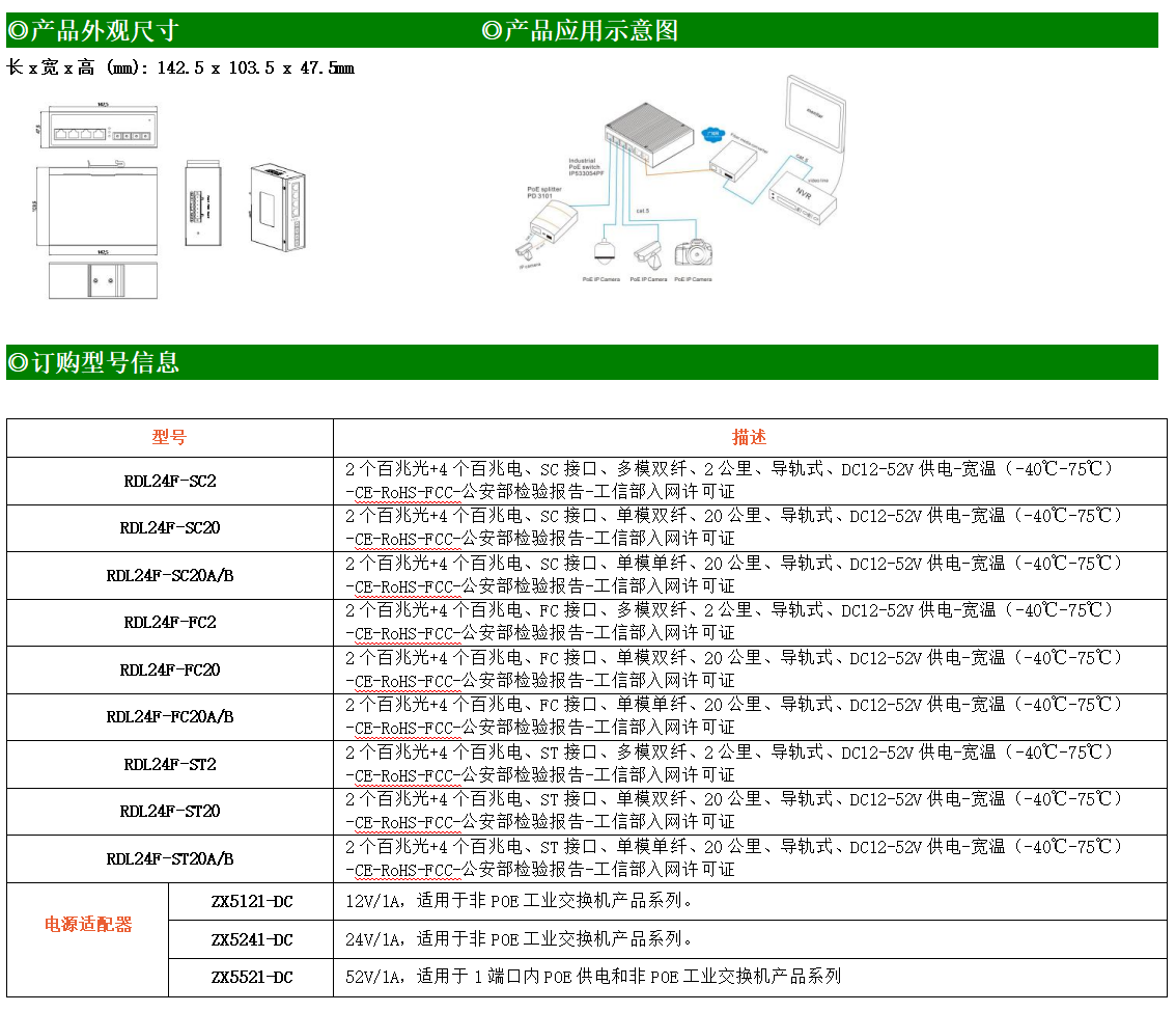 4路百兆電口+2路百兆FX光口工業(yè)級以太網(wǎng)交換機,支持4個10Base-T/100Base-TX電口和2個100Base-X光口。產(chǎn)品符合FCC、CE、ROHS標準。RDL24F系列交換機具有-40℃~75℃的工作溫度,具有超強的堅固度能適應(yīng)各種嚴苛環(huán)境,也可以非常方便的安置在空間緊湊的控制箱中。導(dǎo)軌的安裝特性、寬溫操作及擁有IP40防護等級的外殼及LED指示燈,使RDL24F成為一個即插即用的工業(yè)級設(shè)備,為用戶的以太網(wǎng)設(shè)備聯(lián)網(wǎng)提供可靠、便捷的解決方案。
