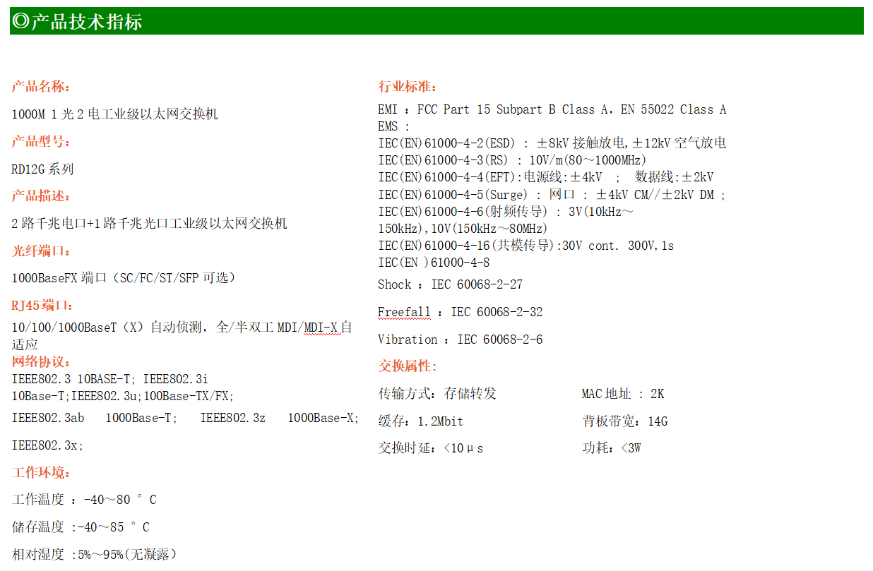2路千兆電口+1路千兆FX光口工業級以太網交換機,支持2個100Base-T/1000Base-TX電口和1個1000Base-X光口。產品符合FCC、CE、ROHS標準。RD12G系列交換機具有-40℃~80℃的工作溫度,具有超強的堅固度能適應各種嚴苛環境,也可以非常方便的安置在空間緊湊的控制箱中。導軌的安裝特性、寬溫操作及擁有IP40防護等級的外殼及LED指示燈,使YHD12G成為一個即插即用的工業級設備,為用戶的以太網設備聯網提供可靠、便捷的解決方案。