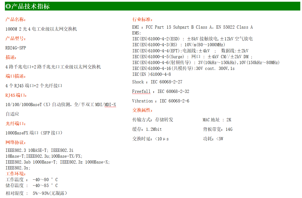 4路千兆電口+2路千兆FX光口工業級以太網交換機,支持4個100Base-T/1000Base-TX電口和2個1000Base-X光口。產品符合FCC、CE、ROHS標準。RD24G交換機具有-40℃~80℃的工作溫度,具有超強的堅固度能適應各種嚴苛環境,也可以非常方便的安置在空間緊湊的控制箱中。導軌的安裝特性、寬溫操作及擁有IP40防護等級的外殼及LED指示燈,使RD24G成為一個即插即用的工業級設備,為用戶的以太網設備聯網提供可靠、便捷的解決方案。