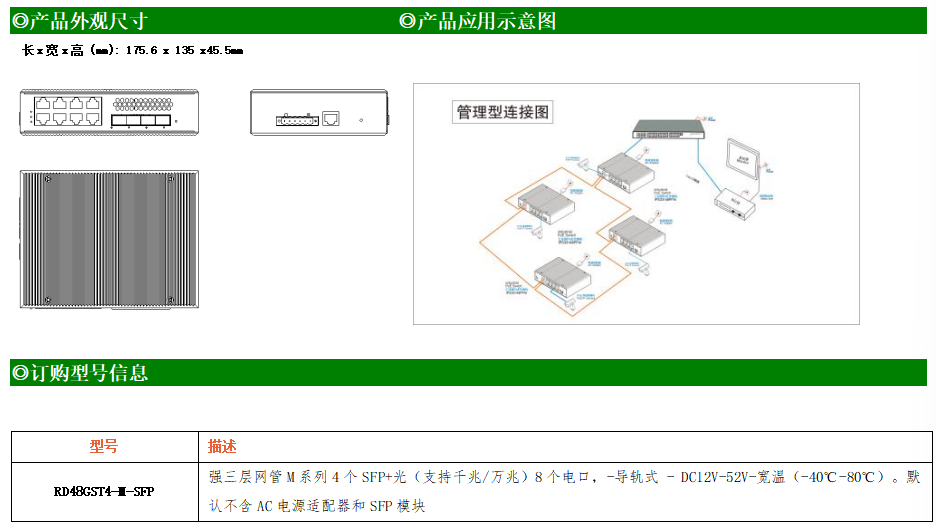 RD48GST4-M-SFP交換機是我司推出的一款萬兆三層交換機,配備4個萬兆SFP+光口和8個10/100/1000M Base-T自適應電口,具備先進的硬件處理能力和最豐富的業務特性。支持IPv4/IPv6 硬件雙棧及線速轉發,使客戶能夠從容應對即將帶來的IPv6 時代其提供高容量的交換能力。RD48GST4-M-SFP交換機具有-40℃~80℃的工作溫度,具有超強的堅固度能適應各種嚴苛環境。導軌式安裝特性、寬溫操作,使RD48GST4-M-SFP的交換機成為一個即插即用的工業級設備,為用戶的以太網設備聯網提供可靠、便捷的解決方案。